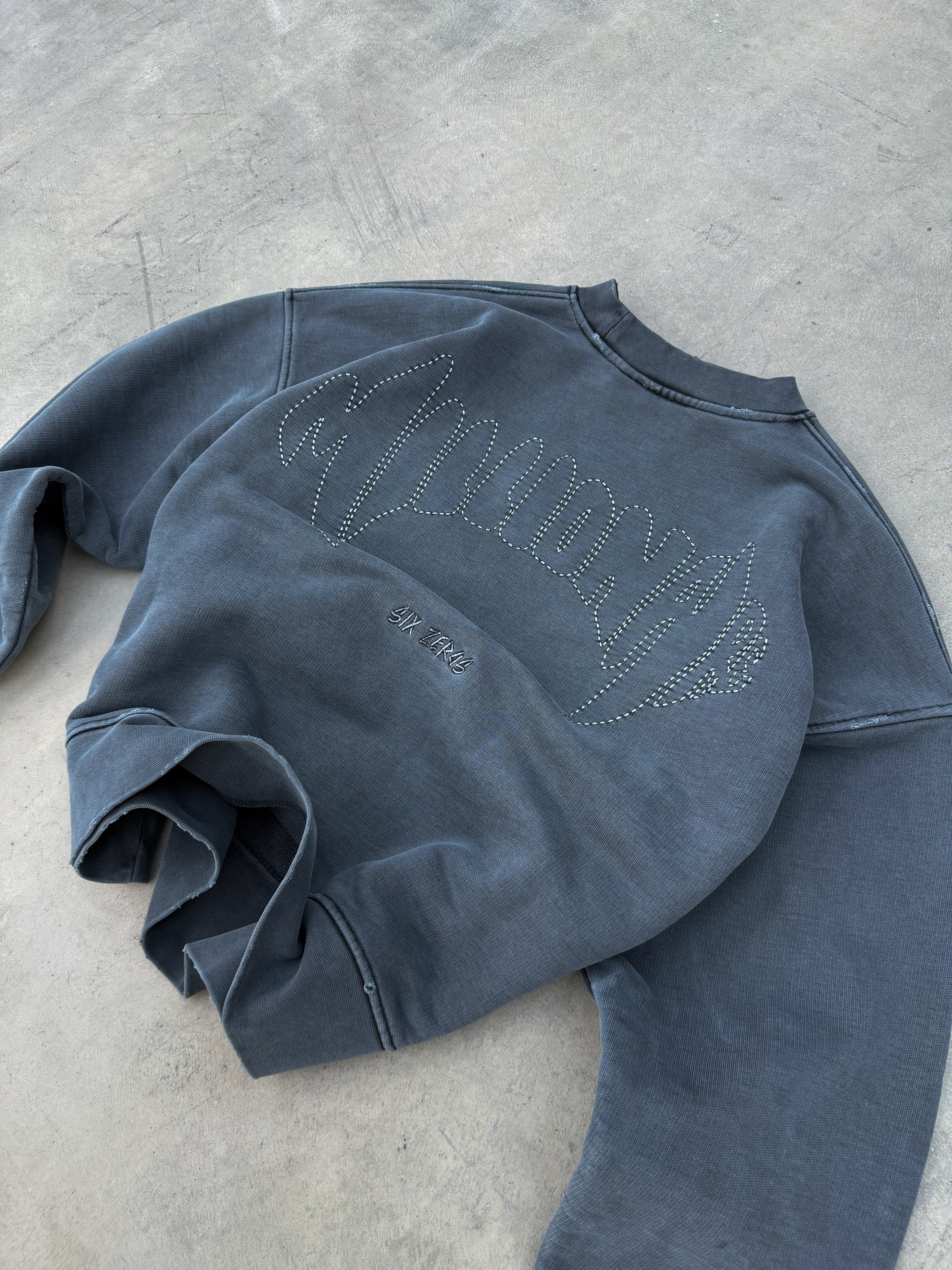 The sweatshirt is constructed as a structural object: precise geometry, controlled volume, and architectural finishing.